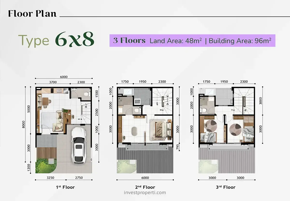 Pilihan rumah Anza Homes tipe lebar 6 memiliki luas tanah 48 m2 dan luas bangunan 96 m2.