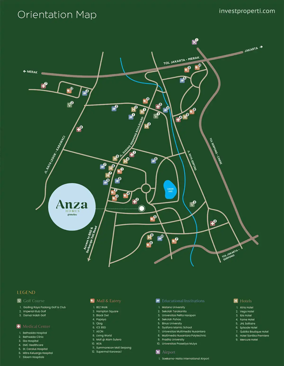 Lokasi cluster Malibu sendiri berada di kawasan strategis yang berbatasan dengan area BSD dan pusat aktivitas di Gading Serpong. Posisi ini memudahkan penghuni untuk menjangkau berbagai fasilitas kota seperti pusat perbelanjaan, area kuliner, institusi pendidikan, serta rumah sakit. Selain itu, kawasan komersial di sekitar perumahan juga berkembang pesat sehingga mendukung kebutuhan sehari-hari para penghuni tanpa harus menempuh perjalanan jauh.
