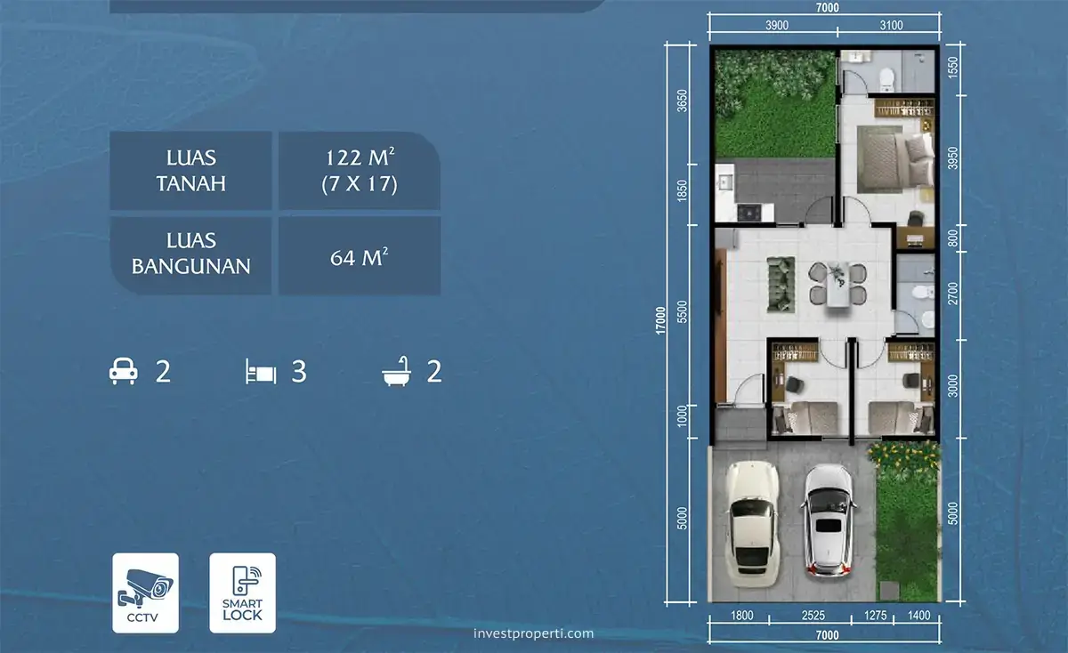 Merupakan pilihan tipe terluas rumah cluster Dhana, tipe Allegra memiliki dimensi 7×17 meter, luas bangunan 64 m2.