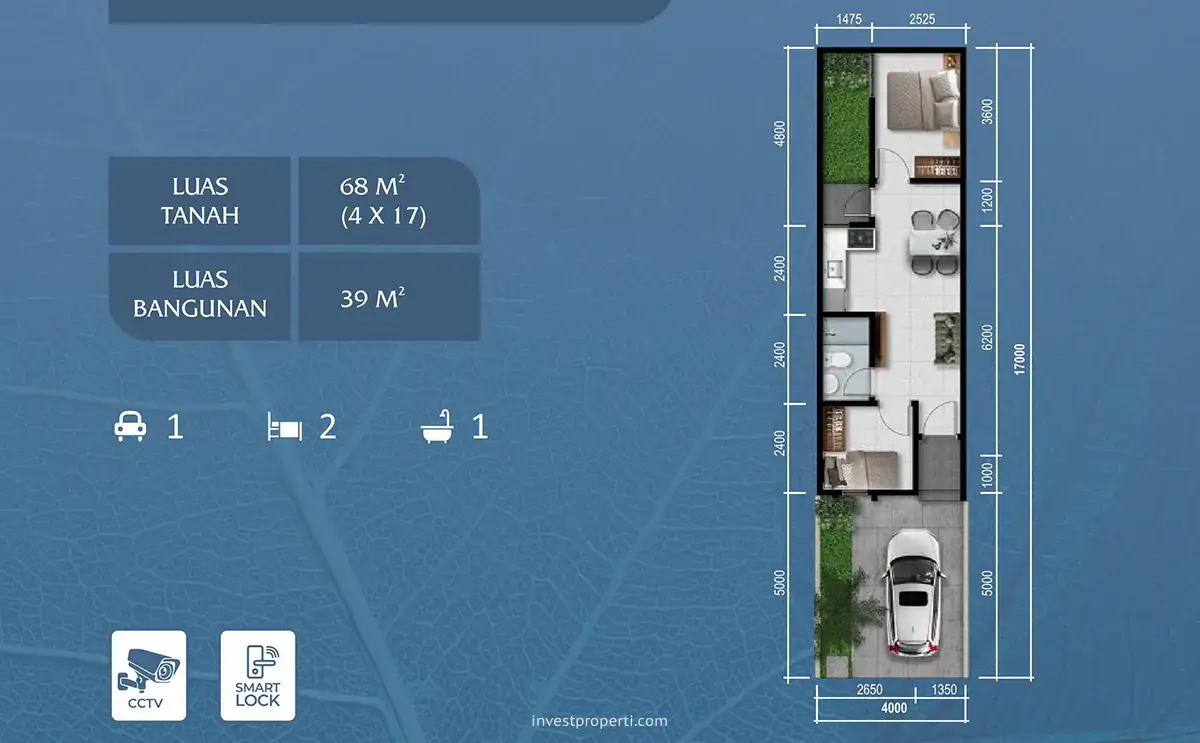 Rumah modern minimalis tipe Avena memiliki 1 lantai bangunan dengan lebar 4 meter dan panjang 17 meter. Menawarkan ruangan rumah dengan: