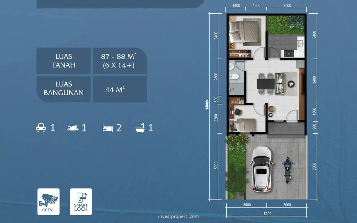 Desain rumah modern minimalis, dengan lebar 6 meter dan panjang 14 meter +, tipe Artha sudah dilengkapi dengan