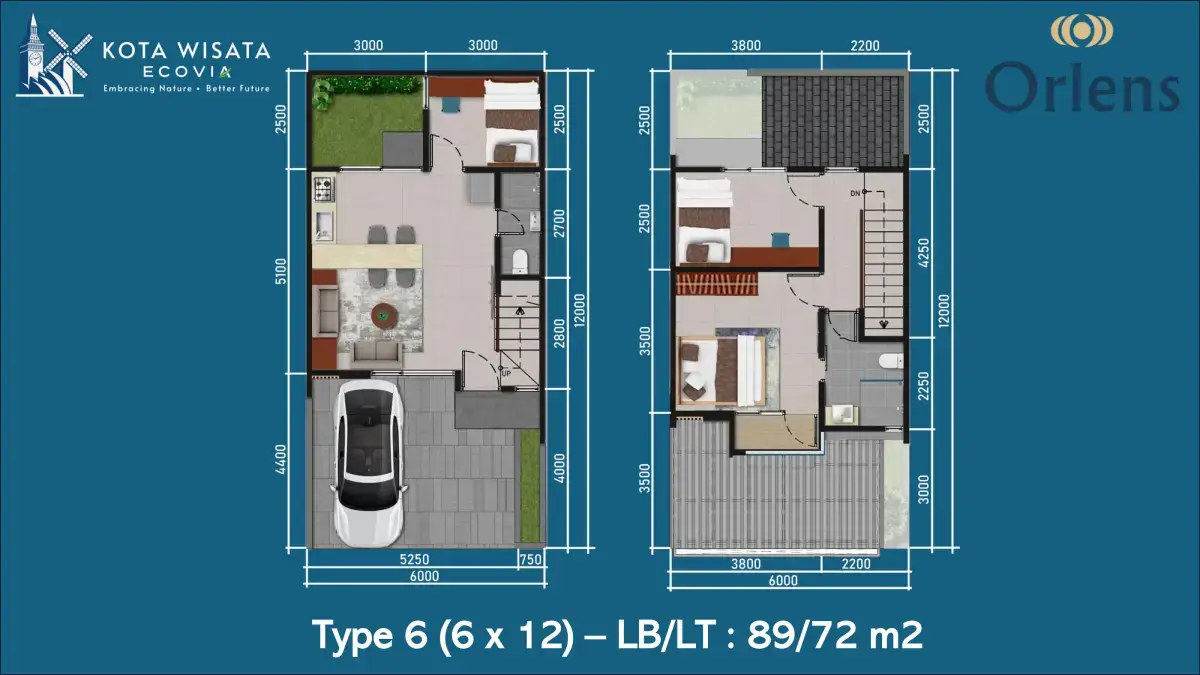 Rumah Orlens tipe 6 memiliki dimensi 6×12 meter dengan luas tanah 72 m2 dan luas bangunan 89 m2. Rumah sudah lengkap dengan: