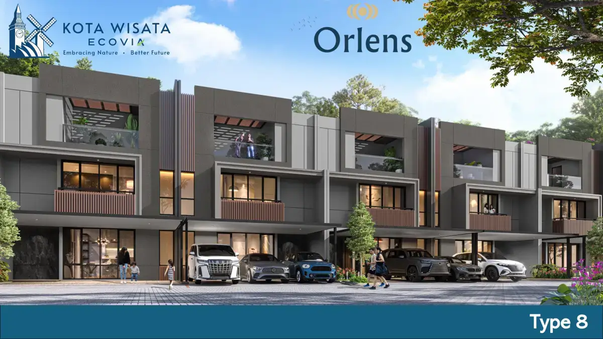 Mengusung gaya arsitektur modern minimalis dengan sentuhan urban kontemporer yang elegan, rumah Orlens Kota Wisata Ecovia menawarkan hunian rumah dua dan tiga lantai dengan bentuk massa bangunan geometris dan proporsi simetris. Setiap unit rumah tersusun berderet rapih (townhouse style), menciptakan tampilan yang seragam namun tetap dinamis.