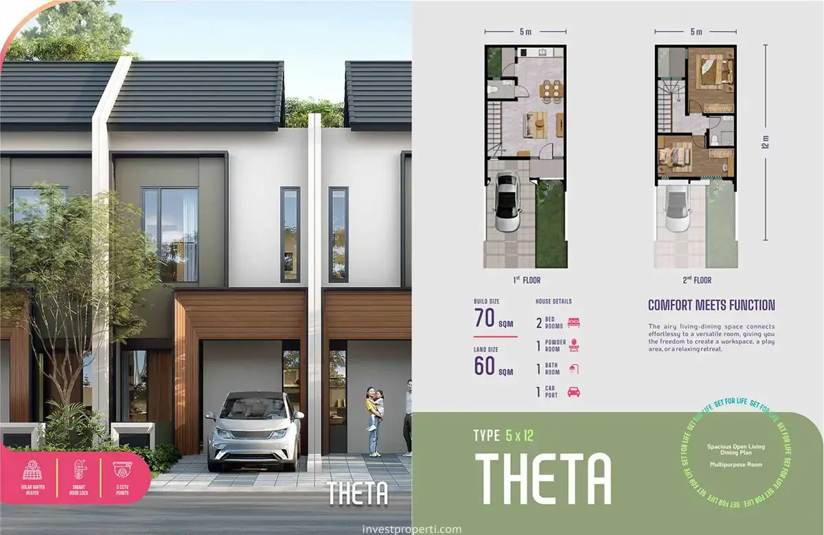 Memiliki dimensi 5×12 rumah Sutera Rasuna tipe Theta menawarkan 2 lantai bangunan dengan 2 kamar tidur, 1 kamar mandi dan 1 carport. Luas tanah 60m2 dan luas bangunan 70 m2. Cocok bagi keluarga baru muda yang sedang mencari rumah pertama mereka.