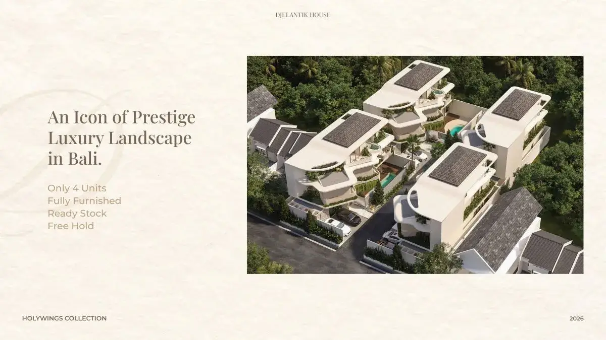 Berlokasi di kawasan prestisius Dewi Sri, mahakarya ini hadir sebagai oase ketenangan yang memadukan arsitektur berani, tradisi Bali, dan gaya hidup modern. Menariknya, proyek ini dirancang sangat terbatas karena hanya tersedia 4 unit saja dengan status hak milik (Freehold) dan sudah dalam kondisi siap huni (ready stock) lengkap dengan perabotan mewah (fully furnished).