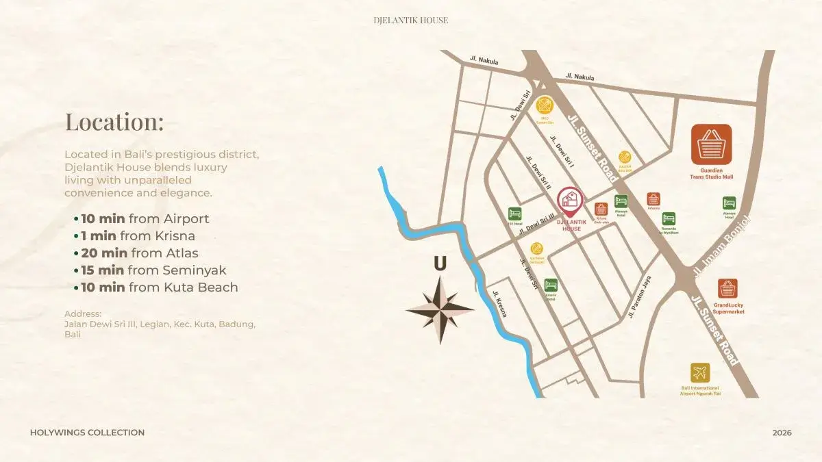 Berbicara tentang properti, lokasi adalah kunci, dan Djelantik House menawarkan kemudahan mobilitas tanpa batas. Terletak persis di Jalan Dewi Sri III, Legian, Kabupaten Badung, vila mewah ini berada tepat di jantung pusat gaya hidup Bali.