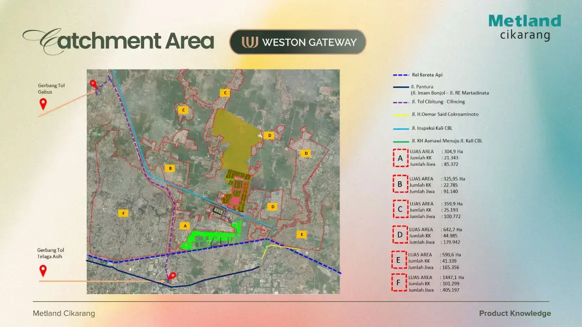 Lokasi strategis dimiliki oleh ruko Weston Gateway Metland Cikarang, dimana memiliki traffic tinggi dari pemukiman aktif di sekitarnya, dan dengan posisi tepat di pintu gerbang kawasan, memastikan akses mudah bagi pengunjung dan penduduk memasuki kawasan ruko. Keunggulan lokasi Weston Gateway terletak pada aksesibilitas premium melalui Jl. Inspeksi Kali CBL, Sukajaya, Cibitung, dekat Tol Cibitung-Cilincing dan Stasiun Metland Telaga Murni untuk mobilitas cepat ke Jakarta.
