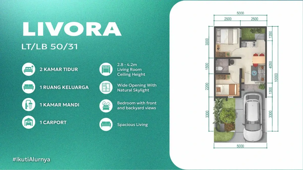 Pilihan rumah 1 lantai desain modern kontemporer dengan luas tanah 60 m2 (5×12 meter) dan luas bangunan 40 m2 (std) dan 45 m2 (sudut). Rumah telah dilengkapi dengan 2 kamar tidur, kamar tidur utama yang luas; pemandangan halaman depan dan belakang, living room ceiling tinggi 2,8 s/d 4,2 m dan beragam fitur lainnya.