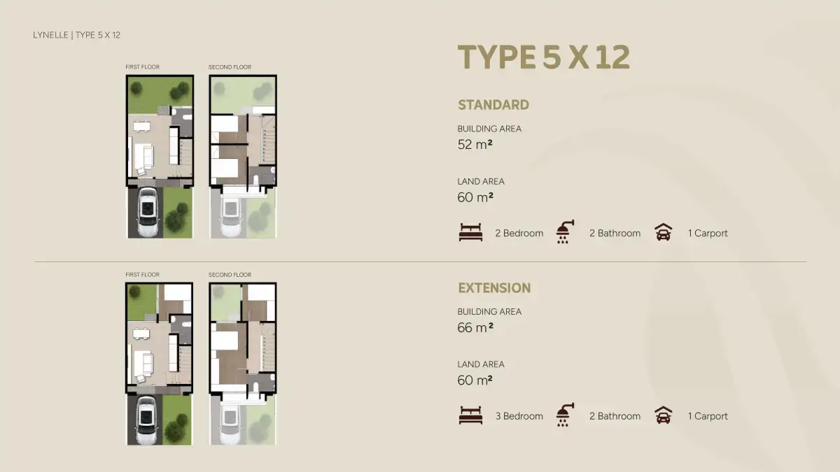- Standard dengan luas bangunan 52 m2. 2 kamar tidur, 2 kamar mandi, 1 carport.
